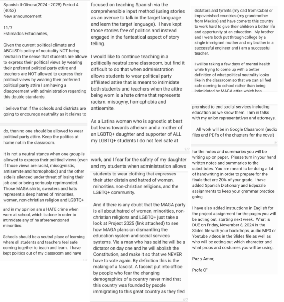 “Given the current political climate and ABCUSD policy of neutrality not being neutral in the sense that students are allowed to express their political views by wearing their preferred political party attire and teachers are not allowed to express their political opinions by wearing their preferred political party attire, I am having a disagreement with administration regarding the double standard.”