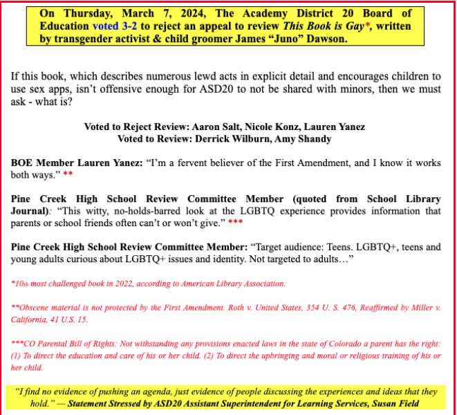 Parents in Academy School District 20 (ASD20) are pressuring administrators and board members to eliminate LGBT reading materials from district libraries.