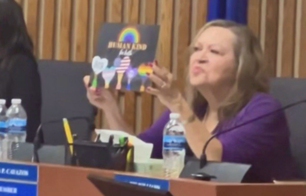 Community members started shouting “Remove her!” after Board Member Linda Cavazos held up an LGBTQ sign: