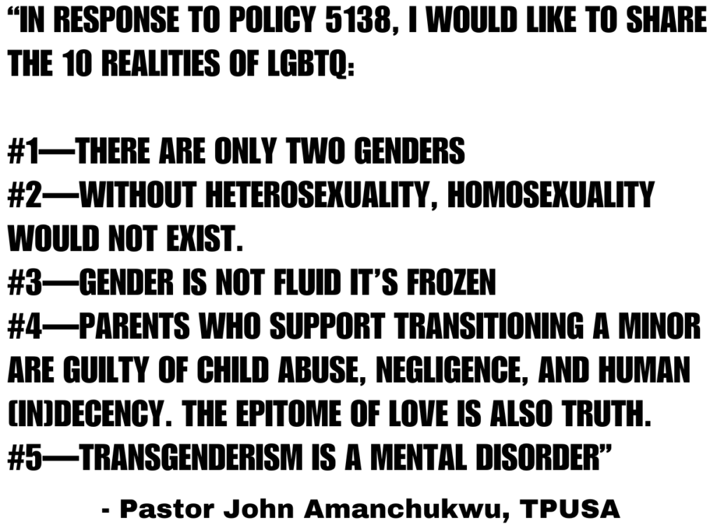 Pastor Amanchukwu was unable to finish his list. As he referenced “anal sex, blow jobs, and orgasms,” Board President Evelyn Garcia Morales stopped his time, cut his mic and asked him “not to use profanity.”
