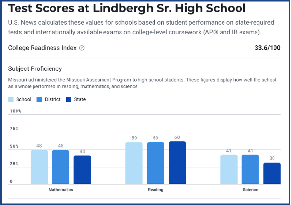 According to data from US News, Lindbergh Schools has an 81.2% white student population, 2.6% black population, and an 18.8% overall “minority enrollment” population. Although the district claims Lindbergh High School was rated “one of the top high schools in the country by US News,” all students — not just those in minority groups — are failing their foundational coursework: