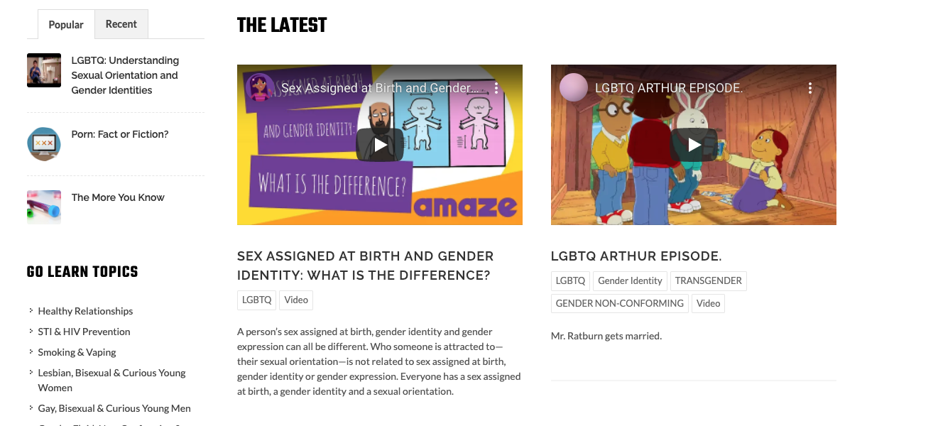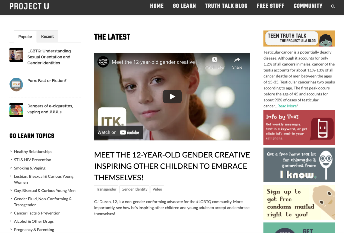 Project U Los Angeles is another source for kids and teens (listed on LAUSD) that promotes sex, masturbation, pregnancy and parenting tips, transgender blogs, differentiating sex assigned at birth and gender identity, and much more. Pictured below are Project U resources for youth and teens: