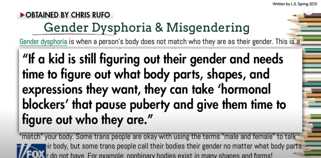 According to the Fox News interview, students as young as fourth and fifth-grade are able to identify as transgender, non-binary, receive puberty blockers, and double mastectomies, without notifying parents.