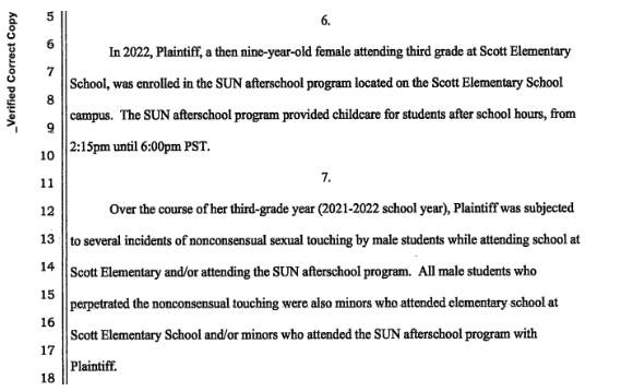 These events took place two years ago (during the 2021-2022 school year) while the plaintiff was enrolled in Scott Elementary School. The lawsuit further states that the student was subject to sexual abuse multiple times during her time at Scott Elementary School and the SUN after-school program: