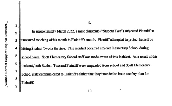 One of the allegations in the lawsuit states that the plaintiff was abused in a class during school hours. In another instance, a student (referred to as Student Two in the lawsuit) brought his mouth to the mouth of the plaintiff. In response, she physically retaliated. Consequently, both she and Student Two were expelled. (See images of the lawsuit below):