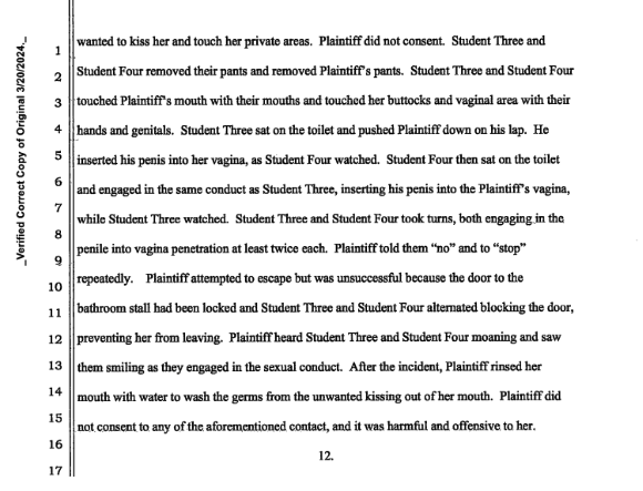 Another incident alleged in the lawsuit describes two students threatening the plaintiff by deceitfully telling the SUN staff that the plaintiff needed to use the restroom. Hereafter, the students allegedly took the plaintiff to the bathroom and abused her sexually several times. The plaintiff did not consent to these actions and told the students to stop repeatedly (see images of the lawsuit below for further detail).