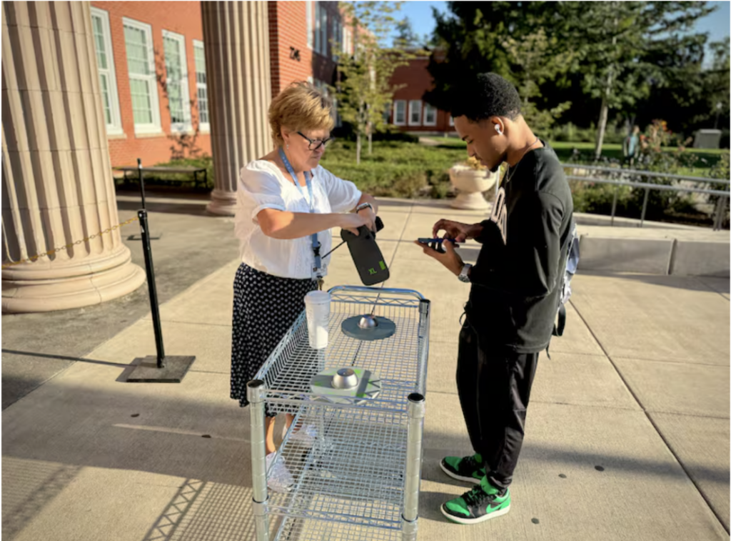 The image below shows a student getting his phone locked inside of a Yondr pouch. On the table between him and the teacher are devices that lock and unlock the pouch.