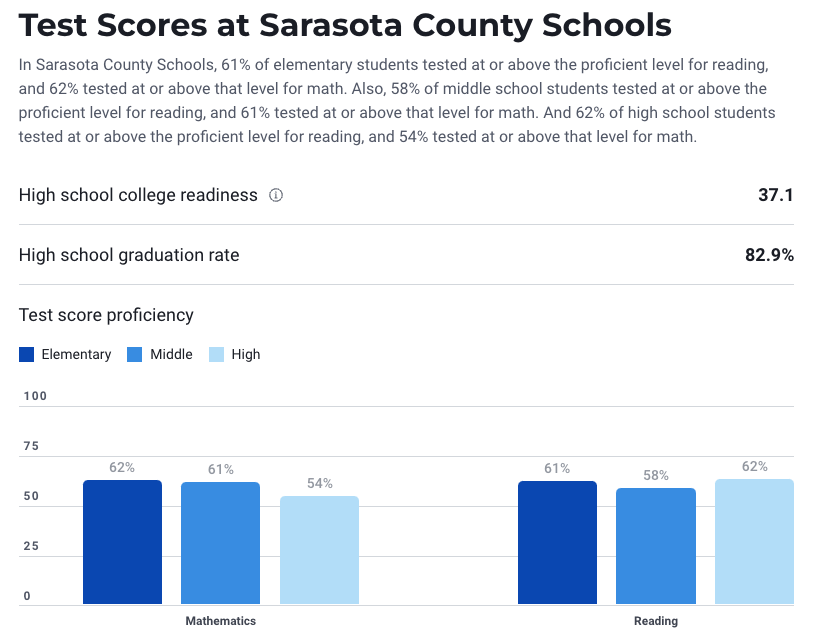 According to US News, Sarasota County Schools test proficiencies are below 63% on all grade levels: