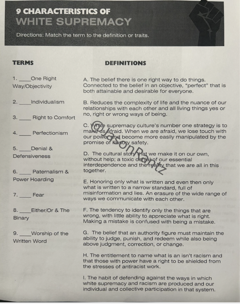 Reporting on this incident, the Jason Rantz Show provided one father’s reaction to the worksheet, which he called “educational malpractice.” The worksheet — a terms and definition matching activity — places several terms in the sphere of “White Supremacy.” Among these terms are “Individualism,” “Fear,” “Perfectionism,” and “Worship of the Written Word,” alongside others.