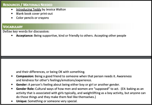 This video, featuring the SPS Health Education Specialist Brennon Ham, corresponds to lessons with definitions of words such as “compassion,” “gender role,” and “unique.” A screenshot of the “Introducing Teddy” lesson for kindergarteners can be seen below.