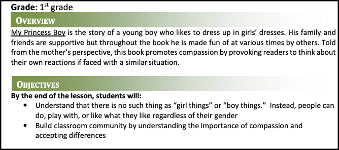First-graders are reading “My Princess Boy” by Cheryl Kilodavis. The lesson overview outlines a story about a young boy who is subjected to ridicule by his peers for wearing girls’ clothes. One lesson objective says “there is no such thing as ‘girl things’ or ‘boy things.’”