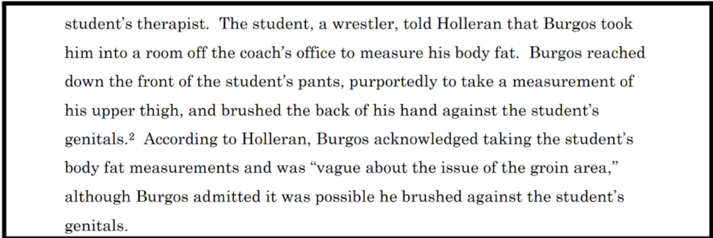 Eventually, the school’s athletic director unlocked the door and entered the room. After being asked “What is going on?,” Burgos told the director that he was stretching A.H.’s back. The athletic director recommended another stretching exercise and left the room. Nothing further was done about this incident.