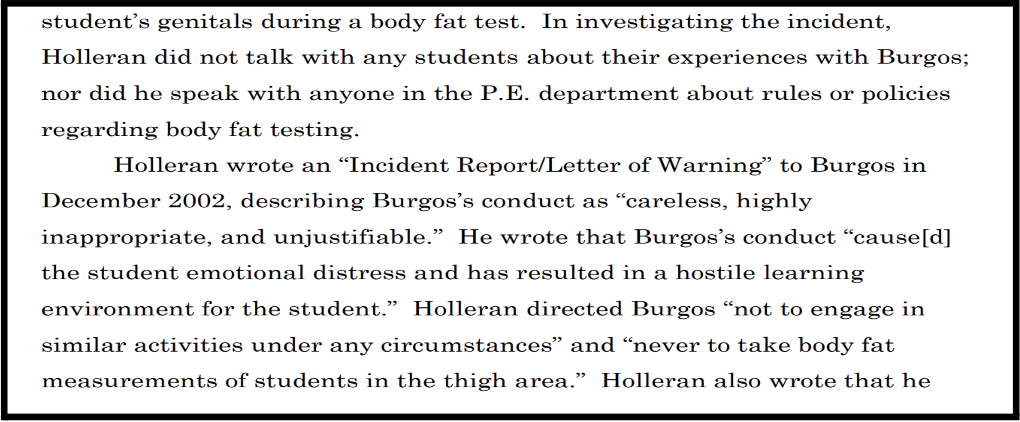 Tamalpais High School Principal Holleran was informed of the alleged incident, finding the description of the coach’s method of body fat measurement strange and inappropriate. After an investigation of Burgos’s conduct when performing the measurements, the principal ordered him not to do them again:
