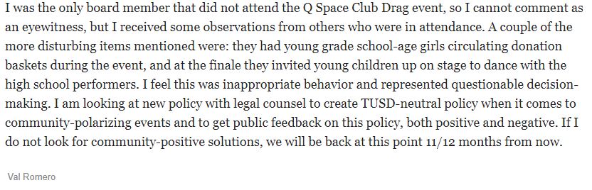“…I come to you today as a parent of three kids within TUSD, as a TUSD school counselor at Tucson High School, and also as the sponsor of the Q Space group that is putting on the drag show this Saturday…
