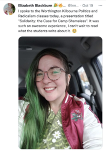 Elizabeth Blackburn, who has since made her account private, describes herself as an “anarchist bimbo” and “fat activist” on her Twitter. On October 19, she tweeted: